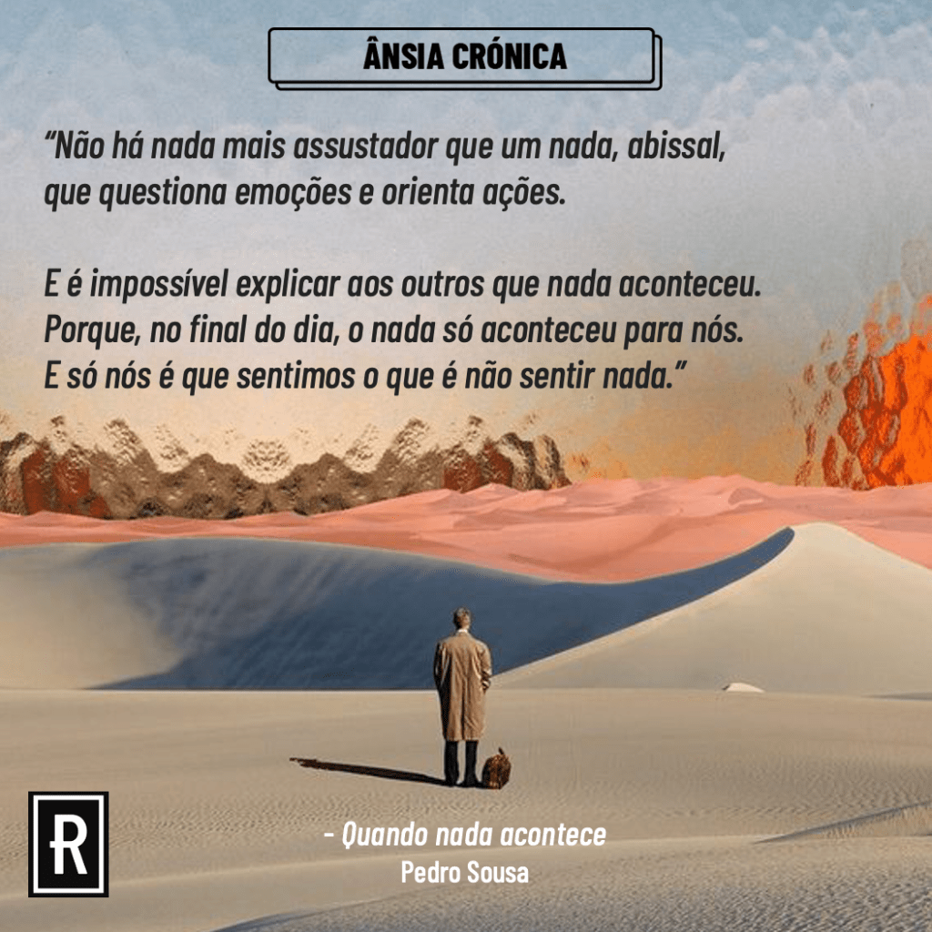 Não há nada mais assustador que um nada, abissal, que questiona emoções e orienta ações. E é impossível explicar aos outros que nada aconteceu. Porque, no final do dia, o nada só aconteceu para nós. E só nós é que sentimos o que é não sentir nada.