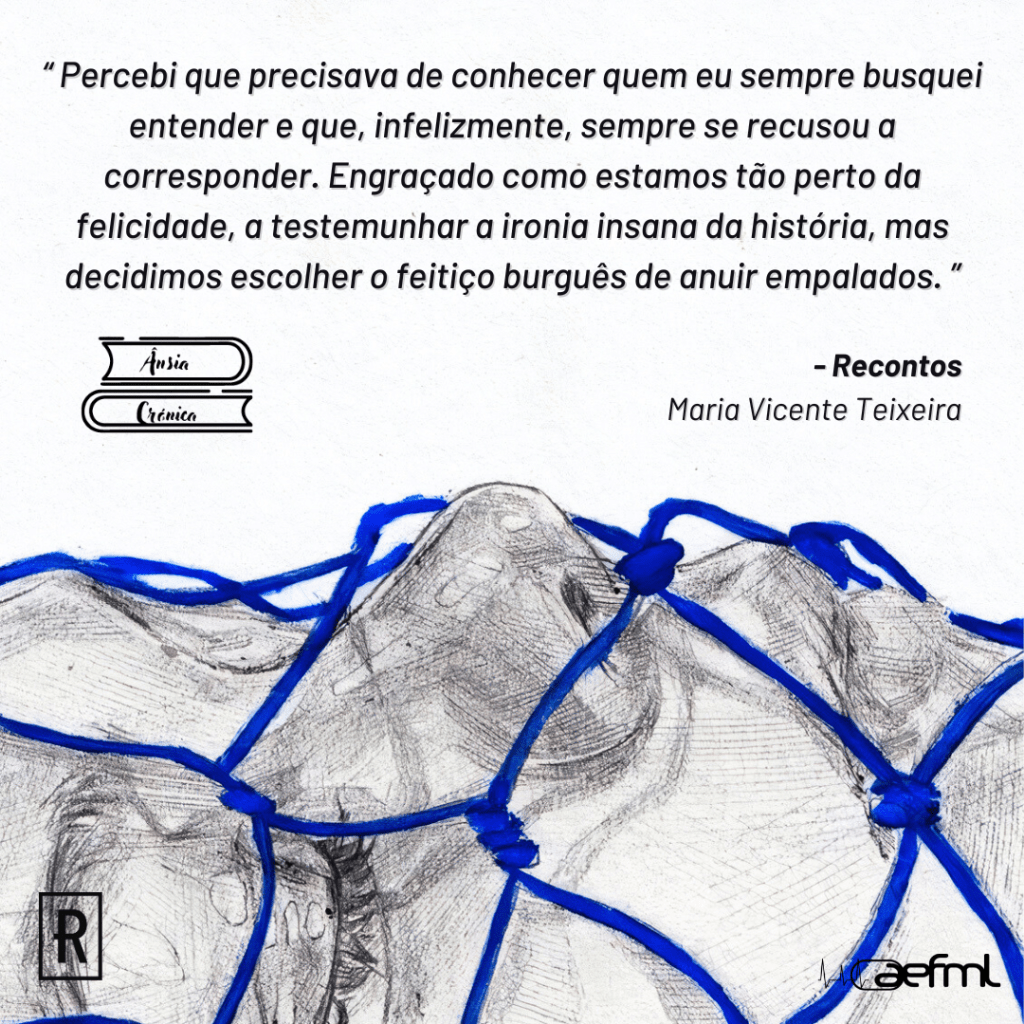 Embora fosse algo que se entoasse, para mim, a infância foi um hino fascista, sem cansaço nem imaginação, apenas um grande bolbo informe de música arrefecida e aqui permanecida. Era eu quem assim ficava – não estava perdida nem acidentalmente encontrada. Percebi que precisava de conhecer quem eu sempre busquei entender e que, infelizmente, sempre se recusou a corresponder. Engraçado como estamos tão perto da felicidade, a testemunhar a ironia insana da história, mas decidimos escolher o feitiço burguês de anuir empalados.