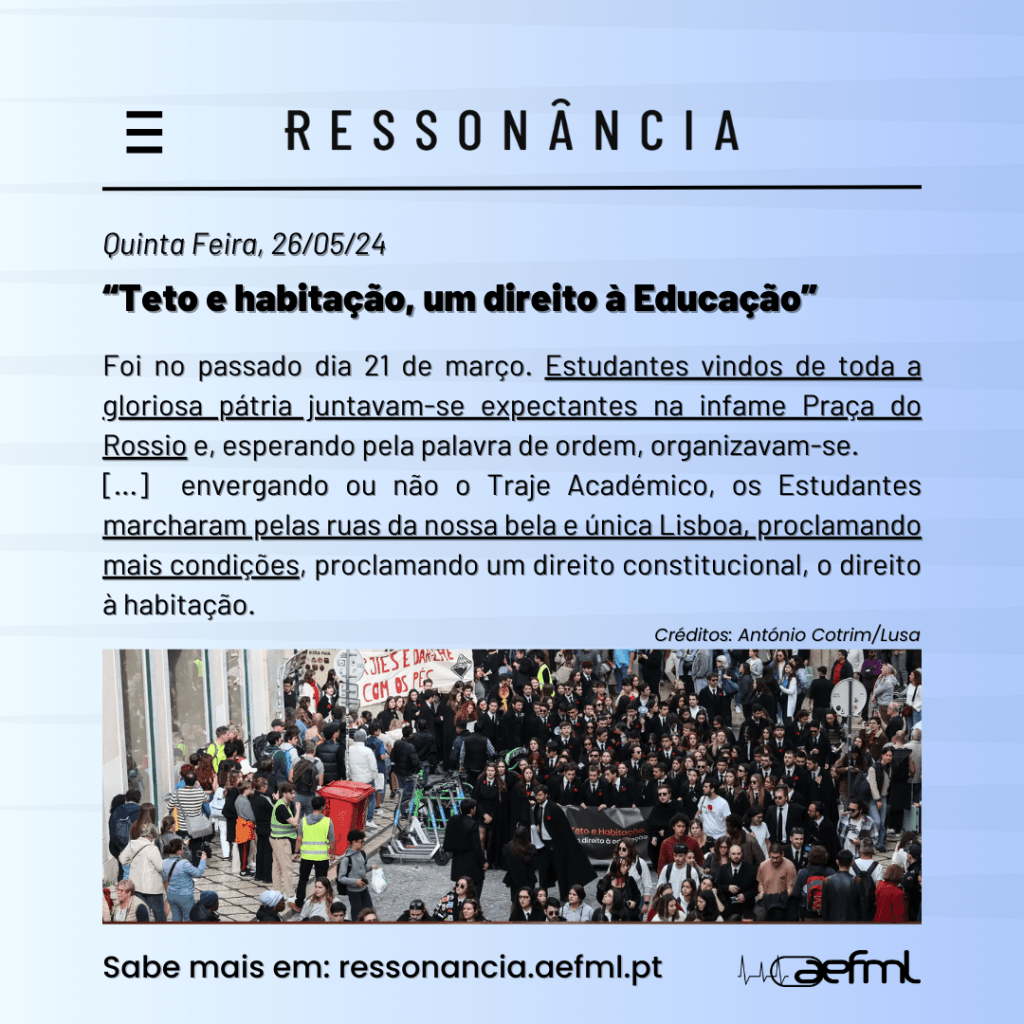 Foi no passado dia 21 de março. Estudantes vindos de toda a gloriosa pátria juntavam-se expectantes na infame Praça do Rossio e, esperando pela palavra de ordem, organizavam-se. Agrupados em instituições, associações, comissões e todo o meio de organização estudantil, envergando ou não o Traje Académico, os Estudantes marcharam pelas ruas da nossa bela e única Lisboa, proclamando mais condições, proclamando um direito constitucional, o direito à habitação.