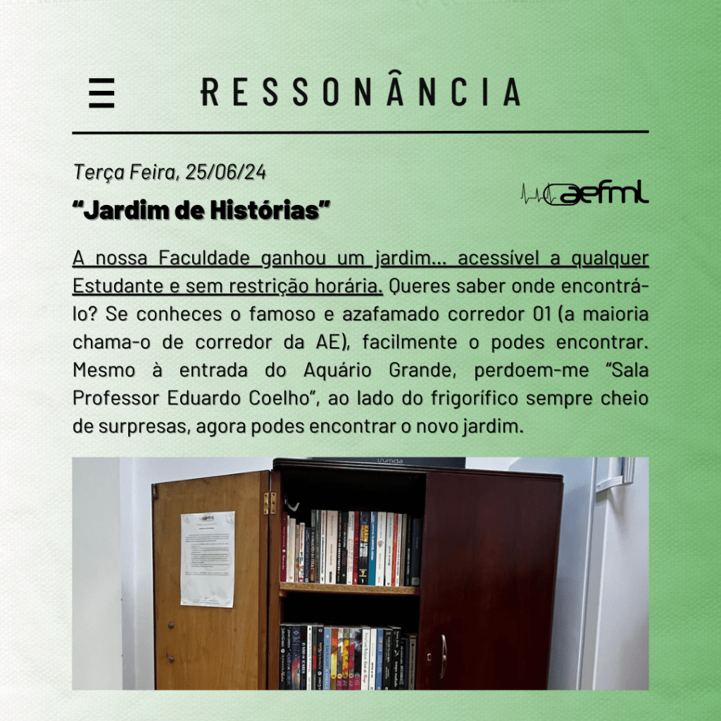 A nossa Faculdade ganhou um jardim… acessível a qualquer Estudante e sem restrição horária. Queres saber onde encontrá-lo? Se conheces o famoso e azafamado corredor 01 (a maioria chama-o de corredor da AE), facilmente o podes encontrar. Mesmo à entrada do Aquário Grande, perdoem-me “Sala Professor Eduardo Coelho”, ao lado do frigorífico sempre cheio de surpresas, agora podes encontrar o novo jardim. Realmente, numa escola onde se estuda em aquários e os Estudantes se reunem religiosamente todos os dias à volta de uma Estátua de pedra, era inconcebível não existir um jardim.